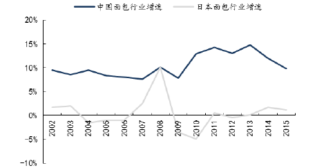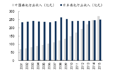 中國面包行業規模已超過日本,行業增速明顯高于日本。2001年,中國面包行業規模只有67億元,是日本的1/3,2015年,中國面包行業規模達到了271億元,同比增長9.8%,行業規模已經超過了日本。原因是當前我國的面包行業增速明顯快于日本,日本的面包市場已經成熟穩定,增長有限。反觀我國面包行業,2001-2015年復合增速達到10.5%,而日本行業規模2001年以來始終保持在240億元左右,增長幅度很小。由此可見,我國面包行業持續穩定增長,未來幾年市場空間巨大。