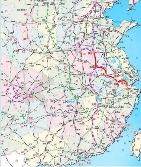 主要包括銀西鐵路(已經開工,設計250,預留350),西安至武漢高鐵(其中武漢至十堰段已經開工,設計時速350公里),然后武漢至九江,九江至南昌至福州。其中昌福鐵路已經通車,也就是此前稱的向莆鐵路。