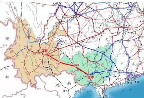 廣州至南寧至昆明高鐵,南廣高鐵已經開通,南昆高鐵部分路段已經通車。