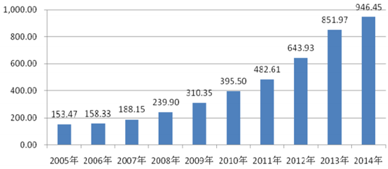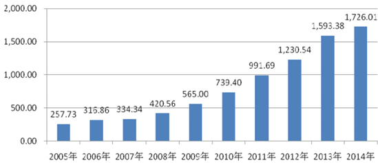 2005-2014 年我國醫藥制造業固定資產投資設備工器具購置情況(單位:億元)