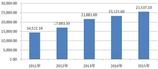 2011-2015 年我國醫藥制藥業主營業務收入情況(單位:億元)