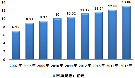 2015年我國水平定向鉆機行業市場規模約13.06億元,同比2014年的12.08億元增長了8.11%