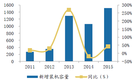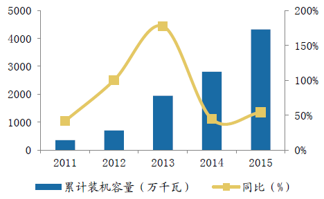 自此,我國新能源開始大力推進,光伏太陽能加速普及,光伏裝機總容量及發電量均大幅增長。據國家能源局統計,截止至2015年底,我國光伏發電累計裝機容量4318萬千瓦,較2014年增長53.94%,年發電量約392億千瓦時,較2014年增長56.80%,新增裝機容量1513萬千瓦,較2014年增長42.74%,完成了2015年度新增并網裝機1500萬千瓦的目標,占全球新增裝機的四分之一以上。