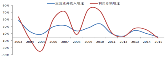 2003-2015年汽車工業重點企業主營業務收入和利潤總額增速