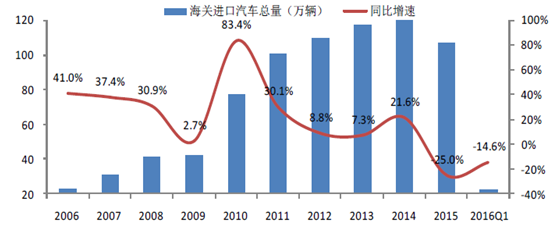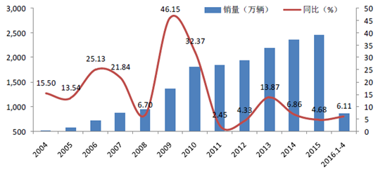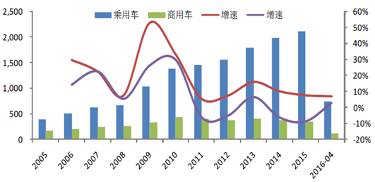 核心提示:受宏觀經濟增速放緩和汽車行業較高保有量影響,我國汽車行業延續低增長態勢。2015 年上半年汽車行業月度銷量出現了負增長,銷量面臨較大的增長壓力。出于調結構促內需的目的,國務院再次出臺購置稅減半政策,2015 年10 月1 日到2016 年1受宏觀經濟增速放緩和汽車行業較高保有量影響,我國汽車行業延續低增長態勢。2015 年上半年汽車行業月度銷量出現了負增長,銷量面臨較大的增長壓力。出于調結構促內需的目的,國務院再次出臺購置稅減半政策,2015 年10 月1 日到2016 年12 月31 日,對購買1.6 升及以下排量乘用車實施減半征收。在此政策刺激下,2015 年4 季度汽車銷量同比增速提高, 年度銷量增速達到4.68%。從保有量來看,2015 年底,全國機動車保有量達2.79 億輛,其中汽車1.72 億輛,私家車總量超過1.24 億輛,每百戶家庭擁有31 輛。