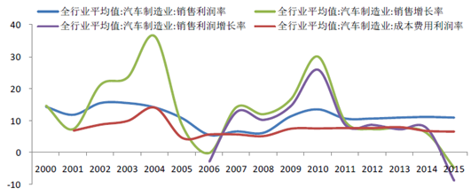 2000-2015年中國汽車制造行業收入、利潤增速(%)