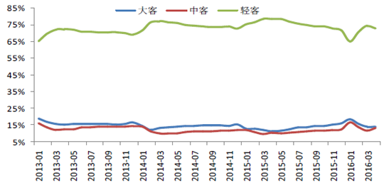 客車銷量下滑主要是由于公路客運量和客運周轉量的同比下滑。高鐵的快速發展,非常大成都上擠壓了短途公路客運市場。2016 年5 月底,公路客運量和客運周轉量累計增速分別同比下滑5%、5.8%。而鐵路客運量增速保持上升態勢,1-5 月份同比增長12.7%。