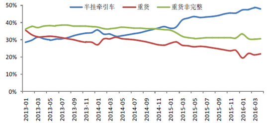 今年重卡市場增長的主要原因在于:第一是政策原因,2015 年1 月1 日柴油車國四排放標準全面實施,導致2014 年四季度出現一定程度的提前購買,拉低了2015 年的重卡銷量,進而致使2015 年上半年銷量基數較低,為2016 年上半年的增長奠定了基礎。第二,增長主要依靠物流車尤其牽引車的拉動,工程車市場需求仍然較弱。牽引車的增長主要是受國內物流市場的拉動,上半年盡管固定資產投資增速較低,但是國內消費增長比較平穩,帶動了物流車的更新換代;再加上400 馬力以上大馬力牽引車走俏,也在一定程度上拉動了老用戶的換車潮。