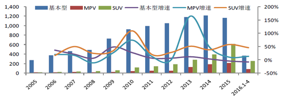 我們預計,SUV 仍然會在2016 年繼續保持超過兩位數的增幅,但是不會繼續2014 年和2015 年超過50%以上的增速。SUV 已經成為紅海市場,未來的增長趨勢將放緩,主要原因是越來越嚴的油耗限制,按照工信部的規劃,國產乘用車平均油耗在2016-2020 年的目標要求降低至5.0L/100km。這一限額,對SUV 車型來說,即便渦輪增壓和混合動力能夠解決部分限值,但整體挑戰還是非常大。