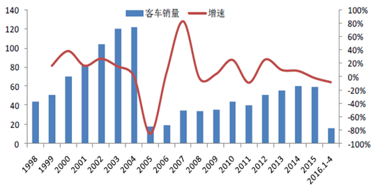 1998-2016年中國客車銷量及增速(單位:萬輛)