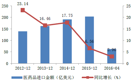 2012-2016年中國醫藥品進口金額情況