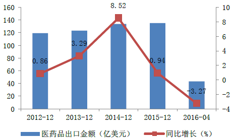 2012-2016年中國醫藥品出口金額情況