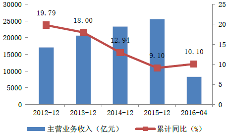 2012-2016年中國醫藥制造業主營業務收入變動情況
