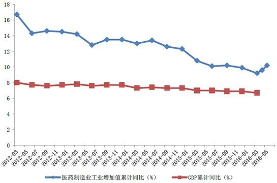 2015年全國GDP增長率減低為6.9%,在供給側改革,經濟持續下行大背景下,2016年一季度全國GDP增長率減低至6.7%,與此同時,醫藥制造業工業增加值增速總體也是呈現下行趨勢,今年1-5月工業增加值同比增長10.2%,基本與2015年水平持平,與GDP增速相比優勢在收窄。