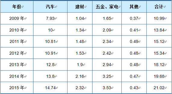 2009-2015年中國(guó)陰極電泳涂料下游細(xì)分領(lǐng)域需求情況(萬(wàn)噸)