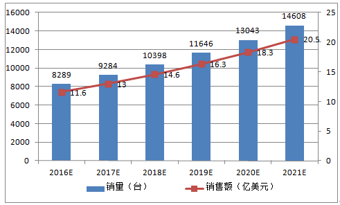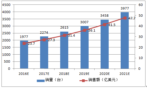 隨著技術的進步和應用規模的擴大,醫用機器人的平均售價將會有所下降,假設銷量按照年均15%增長,售價約120萬美元/臺計算,至2021年,醫療機器人銷量將超過3900臺,其銷售額將在48億美元左右。