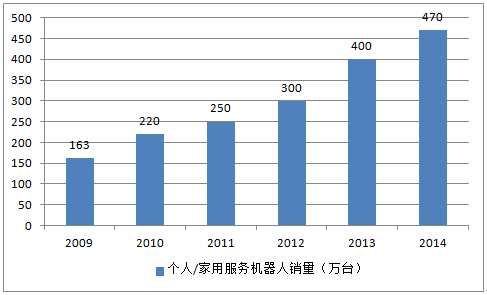 據統計,2012年全球個人/家用服務機器人銷量約為300萬臺,較2011年增長20%,銷售額為12.21億美元;2014年全球個人/家用服務機器人銷量約為470萬臺,較2013年增長17.50%,銷售額約為22.5億美元。