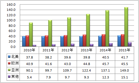 2010-2015年全球無線電通訊模塊市場區域分布:億美元