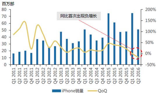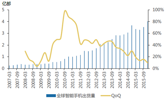 自2008年開始,隨著蘋果引領的智能手機浪潮興起,全球消費電子零組件企業快速發展。而從2015年開始,智能手機逐步進入換機期,增速下臺階趨勢已經確立。2015年國內手機市場銷量4.38億部左右,同比增長僅3%,智能手機市場宣告進入存量時代。在存量時代下,當消費者的基本使用需求已被滿足,性能、審美和差異化三個維度成為手機廠商的角力場。全球智能手機龍頭蘋果同樣陷入增長停滯,蘋果不久之前2016財年第二財季業績,其營收與凈利潤均比去年同期下滑。