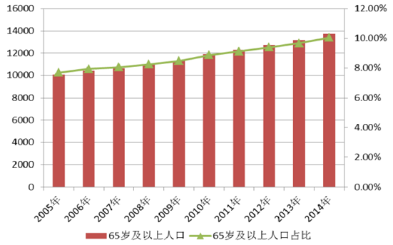 2004年-2015年中國65歲及以上人口數(shù)量及占比