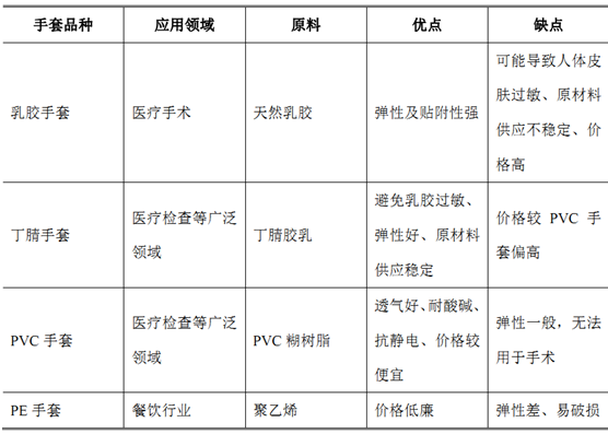 醫(yī)療防護產(chǎn)品主要包括 PVC 手套、丁腈手套、防護服等,一次性手套按材質(zhì)分為乳膠手套、丁腈手套、PVC手套和 PE手套: