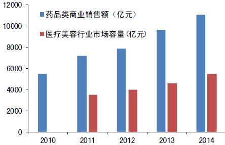 2010-2014年中國醫藥及醫療美容市場規模
