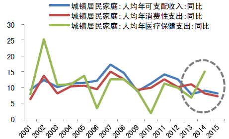 2001-2015年中國城鎮居民家庭人均年可支配收入、年消費性支出、醫療保健支出