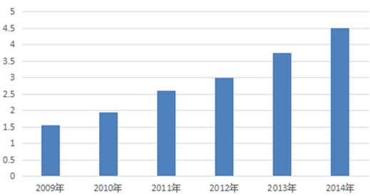 2009—2014年中國健康服務產業市場規模(單位:萬億元)