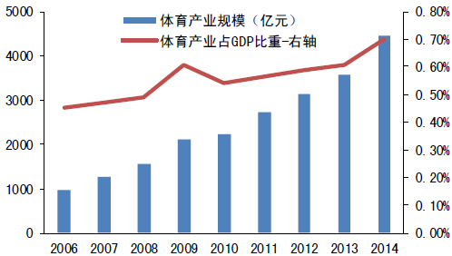 4、體育產業市場規模巨大且政策利好不斷。2014年體育產業市場規模達4454億元,2006-2014 年的復合增長率約為20.78%,體育產業占GDP比重0.70%,發達國家體育產業占GDP比重在2%-3%之間,隨著消費升級與健康意識提高,體育產業未來還有很大的市場空間,同時,政策利好也推動體育健身產業發展。2014 年國務院出臺《關于加快發展體育產業促進體育消費的若干意見》,將全民健身上升為國家戰略,把體育產業作為綠色產業、朝陽產業培育扶持。文件指出到2025年體育產業總規模超過5萬億元,人均體育場地面積達到2平方米,經常參加體育鍛煉的人數達到5億。