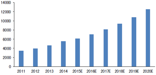 5、醫療美容市場未來增長空間大。從市場規模和客戶群發展看,我國醫美市場保持較高速增長,未來依然有加大空間。據產業信息網報,我國醫療美容市場總產值2014年已達5530億,年增長率接近20%,預計2016至2020年,年均增長率約15%,2019年將突破萬億,2010至2013年,我國醫療美容人數由340萬次增長至537萬次,預計2015年超過700萬次,年均復合增長率約15%。