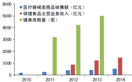 2010-2014年中國醫療器械、保健品、健身房市場規模