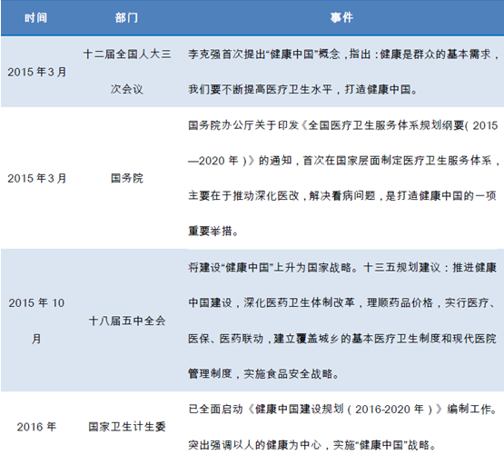 十三五規劃建議將“健康中國”建設上升為國家戰略。十三五規劃建議提出,推進健康中國建設,深化醫藥衛生體制改革,理順藥品價格,實行醫療、醫保、醫藥聯動,建立覆蓋城鄉的基本醫療衛生制度和現代醫院管理制度,實施食品安全戰略。進入2016年,2月14日國常會上,提出部署推動醫藥產業創新升級的政策要求。持續不斷的健康相關政策出臺,令大健康產業的發展迎來政策蜜月期。