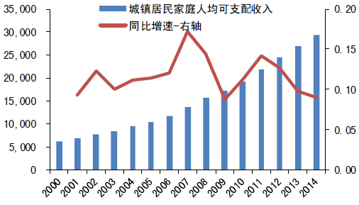 我國居民收入的提升為大健康產業發展奠定了購買力基礎。國際發展經驗顯示當人均GDP超過6000美元時,進入典型的消費升級周期,非生活必需品消費將成為主。2011年以來,我國人均GDP超過6000美元,居民可支配收入持續增長,從2008年15,780元增加到2014年29,381元。伴隨收入增加,居民醫療消費支出保持較高速增長,2011至2014年,城鎮居民醫療保健類支出年均增長率為10.66%,高于居民消費性支出10.35%的增速,且近年來呈現明顯上升趨勢,2014年醫療保健類支出增速為14.91%,大幅高于8.01%的消費性支出增速與8.98%的居民可支配收入增速。
