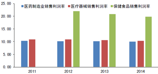 2011-2014年中國醫藥、醫療器械、保健食品銷售利潤