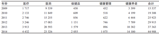 2009—2014年中國健康服務產業結構(單位:億元)