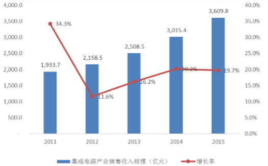 核心提示:顯示:2011 年,我國集成電路行業總產值達到 1,933.7 億元,同比增長 34.3%。2015 年我國集成電路行業總產值達到 3,609.8 億元,2011-2015 年年均增長率達到 16.9%。我國集成電路進口依賴度高,國內芯顯示:2011 年,我國集成電路行業總產值達到 1,933.7 億元,同比增長 34.3%。2015 年我國集成電路行業總產值達到 3,609.8 億元,2011-2015 年年均增長率達到 16.9%。