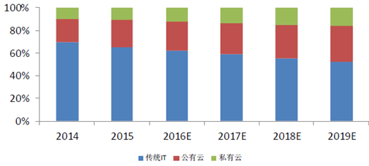2014-2019年傳統(tǒng)IT、公有云、私有云投入比例測(cè)算