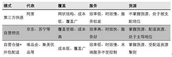 電商物流模式中,以阿里為主的第三方運(yùn)營(yíng)模式占到電商 B2C 市場(chǎng)份額 60%左右;自 營(yíng)物流的京東等電商大約占到 30%的市場(chǎng)份額;采用自營(yíng)倉(cāng)儲(chǔ)+外包配送的電商,如唯 品會(huì)、聚美優(yōu)品等,占到 5%左右。在消費(fèi)需求多樣化的趨勢(shì)下,除了商品價(jià)格,消費(fèi) 者更加注重綜合購(gòu)物體驗(yàn)。物流作為電商經(jīng)營(yíng)活動(dòng)的基礎(chǔ),很大程度上影響消費(fèi)體驗(yàn)。