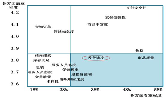 據(jù)調(diào)查顯示,影響消費(fèi)者網(wǎng)購(gòu)行為由多重因素導(dǎo)致,包括了網(wǎng)頁(yè)、支付、物 流和售后等。其中,除了商品質(zhì)量和價(jià)格,發(fā)貨速度成為消費(fèi)者最為看重的條件。但是由于消費(fèi)者的滿意度不高,電商在物流服務(wù)方面的提升空間還很大。