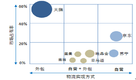 在 B2C 模式中,數(shù)據(jù)顯示,天貓+京東占據(jù) 80%以上的市場(chǎng)份額,所以我們以這兩家 企業(yè)的物流模式作為 B2C 時(shí)代的代表。