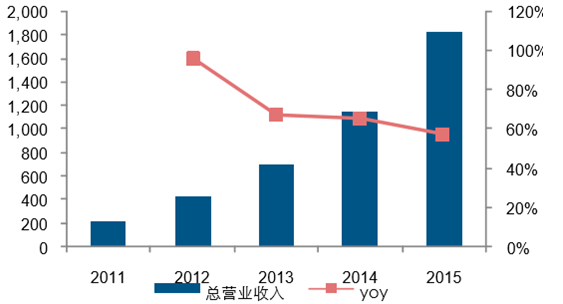 截止到 2015 年中國(guó)網(wǎng)購(gòu) B2C 市場(chǎng)維持 50%以上增速(億元)