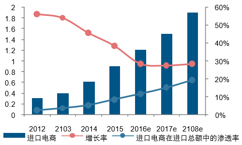 進(jìn)口電商的滲透率不斷增加(萬(wàn)億元)
