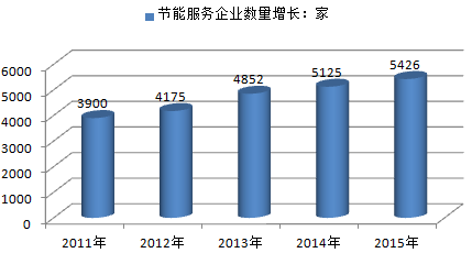 “十二五”是中國節能服務從業隊伍蓬勃發展的黃金5年。2015年全國從事節能服務業務的企業總數達到5426家,比“十一五”期末增長了近6倍;行業從業人員達到60.7萬人,比“十一五”期末的17.5萬人增長了近2.5倍。節能服務產業總產值從2010年836.29億元增長到3127.34億元,年均增長率為30.19%;合同能源管理投資從2010年287.51億元增長到1039.56億元,年均增長率為29.31%。“十二五”累計合同能源管理投資3710.72億元,形成年節能能力1.24億噸標準煤,減排二氧化碳3.1億噸。