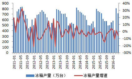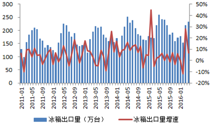 2016年中國冰箱產銷量、庫存及出口統計