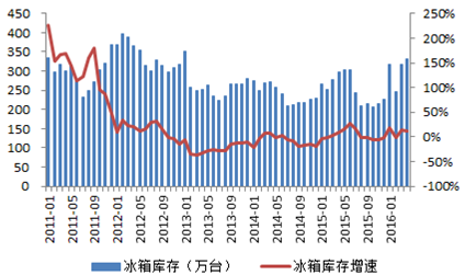 2011-2016年中國冰箱庫存及增速