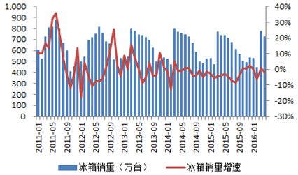 2011-2016年中國冰箱銷量及增速