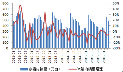 2011-2016年中國冰箱內銷及增速
