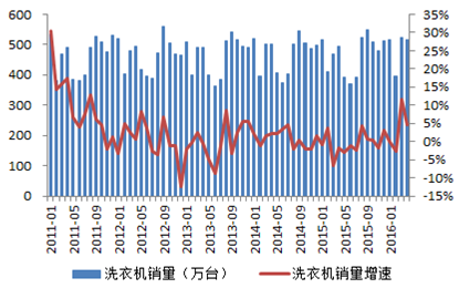 2011-2016年中國洗衣機銷量及增速