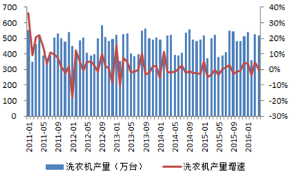 2011-2016年中國洗衣機產量及增速