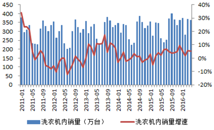 2011-2016年中國洗衣機內銷及增速